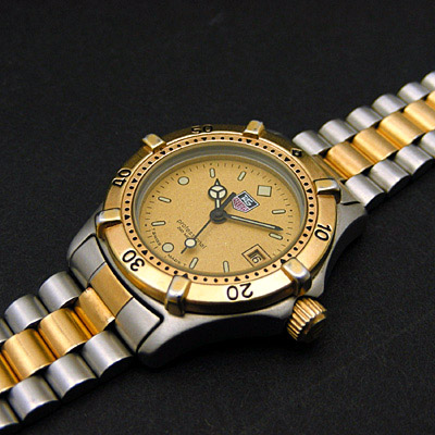 一目でそれとわかる独特のデザインとその性能の高さから人気のタグ・ホイヤーは、レディースモデルでもメンズモデルと同等以上のクオリティの高い時計を製造しています。今回ご紹介するこのモデルはレディースのダイバーズですが、逆回転防止ベゼル、ベンツ針、フリップロック付バックル、 200m防水(新品時)、エクステンション機能、ねじ込み竜頭と、ダイビングに要求される基本的な機能はほぼ備え、かつデイト表示、3連ブレス、コンビ配色といった日常使用にも嬉しい仕様も採用したオススメの一本です。多少の当たりや水も気にせずに使える、パートナーウオッチとしてどうぞ。