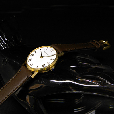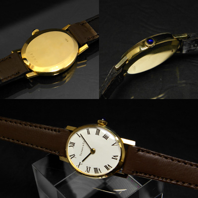 オーバル(長方形)のケースは綿密な計算により適度な大きさと心地よい厚みで作られており、直に身につけるアクセサリーを得意とするティファニーの実力を垣間見ることが出来ます。ケースは価値ある18K製。オリジナルのベルト(写真の物は社外品の新品です)に付属する尾錠(ベルトを固定する部品)も14K製です。柔らかさを残した白文字盤にローマ数字でインデックス(時を表すしるし)を描いています。どこか懐かしさを感じさせる、優しい印象の腕時計に仕上がっています。
