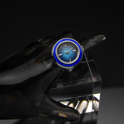希少な指輪タイプの時計です。機械式時計の技術が円熟すると共に、女性用のムーブメントは小型化が進み、指輪の大きさに納めることが出来るようになりました。深い青色の文字盤は中心に向かって色が明るくなり、水中から見上げた太陽を連想させます。文字盤周囲をエナメル調の青いリングで装飾し、同じ青系でも変化のある表情が楽しめます。貴重な指輪時計であると同時にさらい数の少ないデッドストックの商品です。保管キズ程度の美品は他にはないでしょう。当時のタグも付属します。