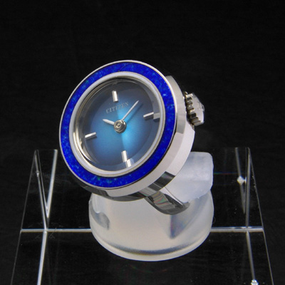 シチズンの指輪型時計(リングウオッチ)です。シチズン社はセイコーと並んで日本を代表する時計メーカーです。セイコー同様、多くのスポーツ大会の公式ウオッチを担当するなど世界的に有名な日本企業の一つです。シチズン社は1918年に「尚工舎時計研究所」として創業しました。1924 年に懐中時計「CITIZEN」を発売し、これが「シチズン」ブランドの発端となりました。1930年には「シチズン時計株式会社」が設立され、1936 年には現在の西東京市に田無工場が完成しました。戦時色の強まった1938年には軍部の意向により「大日本時計株式会社」へとの社名を変え、戦後はGHQ により工場が賠償施設指定されるなどの困難がありましたが、その後セイコー社と並ぶ国内時計メーカーとして成長しました。1948年に社名を「シチズン時計株式会社」に戻し、現在に至ります。時計メーカーとしての側面ばかりでなく、電子機器や電子部品メーカーとしての側面を持ち、時計においてもチタン外装や太陽光発電、電波修正など最先端の技術を取り入れたものを多く提供しています。