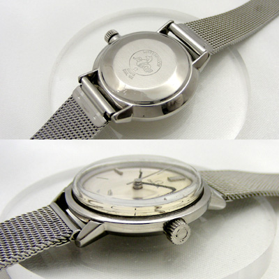 オメガの手巻き腕時計です。女性らしい印象を与えるラウンドケースです。当時の女性用の時計としては高級モデルに属する、一体型のワンピースケースを採用しています。文字盤のデザインはシンプルですが「OMEGA」の文字の大きさ、針の長さ、配置など一分の隙もなく、さすがオメガとうならされる一本です。メッシュベルトは装着感もよく、やわらかく腕にフィットします。ビジネスシーンにはもちろん、冠婚葬祭でも問題ありません。いつも身につけていられる一本です。