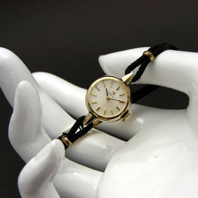 オメガの手巻き腕時計です。14KGFのケースは女性らしい小さな丸形です。ベルトを止めるラグの部分は有機的な曲線で構成され、デザインのアクセントとなっています。優しい輝きを放つ金属質の文字盤に金色のインデックスとオメガマークが輝き、黒い針との組み合わせは高級感を感じさせるだけではなく、非常に見やすく実用的です。装着感が良く、アンティークらしい紐ベルト仕様です。ベルトの留め金もオメガ純正です。フォーマルシーンにはもちろんのこと、毎日お使いいただけるパートナーのようなアンティーク時計です。そのブランド力、作りの良さから、オメガ製のアンティーク時計は一生の宝物になるでしょう。
