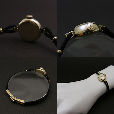 文字盤にはわずかですが経年変化が見られます。製造から長い年月を経ているため、ケースにはスレ、コキズはありますが、アンティークの味として納得できるレベルです。ケースはクリーニング済みです。紐ベルトはカットすることで長さを調整できます。調整済みのムーブメントは問題なく動作しており、しばらくはメンテナンスの必要がありません。時計の精度は姿勢や利用環境によって異なりますが、1日に60秒内外のずれに収まっています。現状で腕周りが最大16cm程度まで使用可能です。ケースの大きさは横約16mm(竜頭は除きます)です。