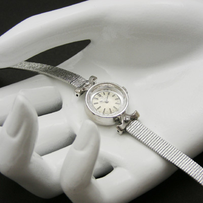 オメガの手巻き腕時計です。デザインされたラグにダイヤを配した高級カクテルウオッチです。ケース素材は価値のある14Kのホワイトゴールドです。みる角度によってキラキラと輝くプリズム風防を採用。ブレスは社外品のステンレススチールなので、腐蝕や歪みなど無く安心してお使いいただけます。ドレスなどの装いはもちろんのこと、Tシャツとジーンズのようなラフでカジュアルな格好にさらりと着けてもよく似合います。小さめのフェイス、ダイヤ装飾、WG無垢、プリズム風防、そしてオメガのブランド力と、女性用アンティークウオッチの人気の要素を全て備えた、早い者勝ちのお買い得な一本です。