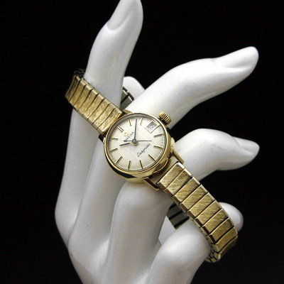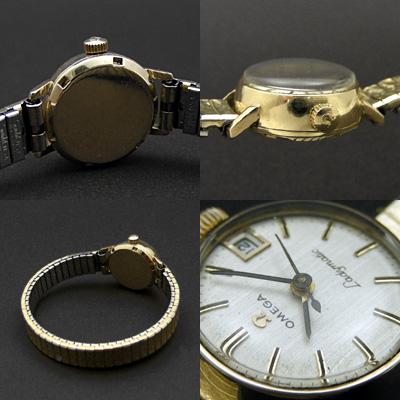 オメガの自動巻腕時計です。レディースでは希少な自動巻のムーブメントを使用していますので、腕に付けるだけでゼンマイが巻き上がり、時計が動き続けます。おそらく1970年代の時計です。ケースは美しさと丈夫さを兼ね備えた14KGF。文字盤には宝飾品などの表面加工でみられる艶消し加工が施してあり、落ちついた印象です。バーインデックスはやや堅い感じになりがちですが、余白の取り方と丸みを帯びたケース形状がそれを上手く押さえています。スーツなどオンタイムにはもちろん、Tシャツとジーンズのような、ラフでカジュアルな格好にさらりと着けてもよく似合います。そのブランド力、作りの良さから、オメガ製のアンティーク時計は一生の宝物になるでしょう。