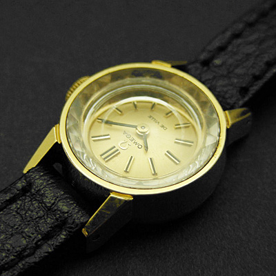 オメガの手巻き腕時計です。オメガの中でもドレッシーなラインである「デ・ビル」シリーズ。高級感のある上質なゴールド文字盤です。おそらく1960年代の時計です。みる角度によってキラキラと輝くプリズム風防が魅力的です。スーツなどオンタイムにはもちろん、Tシャツとジーンズのような、ラフでカジュアルな格好にさらりと着けてもよく似合います。小さいフェイスながらも視認性も高く、時計としての実用性を損なっていません。そのブランド力、作りの良さから、オメガ製のアンティーク時計は一生の宝物になるでしょう。