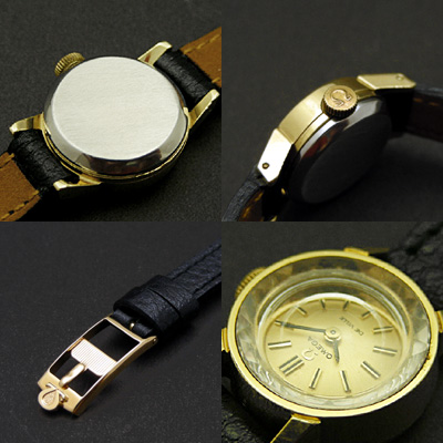 ケースは経年のスレやコキズがありますが雰囲気を損なう致命的なキズはありません。調整済みのムーブメントは問題なく動作しており、しばらくはメンテナンスの必要がありません。時計の精度は姿勢や利用環境によって異なりますが、1日に60秒内外のずれに収まっています。ベルトはフランス製の質感、使用感のよい良品を合わせています。尾錠にはオメガの刻印があります。ケースの大きさは約16.5mm(竜頭は除きます)です。