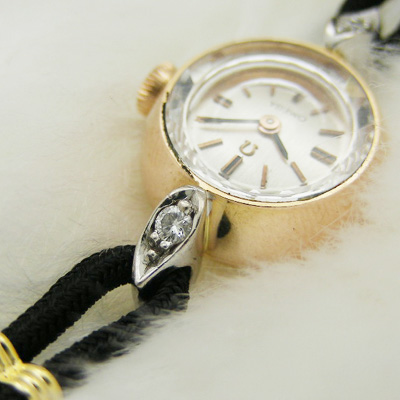 ケースには金素材独特のスレ、コキズはありますが、雰囲気を損なうキズはありません。分解掃除済みのムーブメントは問題なく動作しており、しばらくはメンテナンスの必要がありません。時計の精度は姿勢や利用環境によって異なりますが、1日に60秒内外のずれに収まっています。ケースの大きさは約14mm(竜頭は含みません)です。