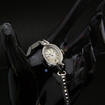 女性の優しい雰囲気を引き立てるオーバル(楕円形)ケースは、価値ある14Kホワイトゴールドを使用。そこに収まる文字盤は経年変化し、アンティーク時計の味わい深さを表現しています。装着のしやすい伸縮タイプのブレスレットを採用。特筆すべきは、その上下の取り付け部分(ラグ)に施されたリーフのモチーフと、それぞれに一粒づつ配されたダイヤ装飾です。全体的にシルバーで統一され清潔感のある仕上がりですが、12時、3時、6時、9時を示すインデックスのみ黒いラインが施され、程よいアクセントとなっています。