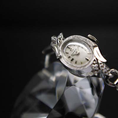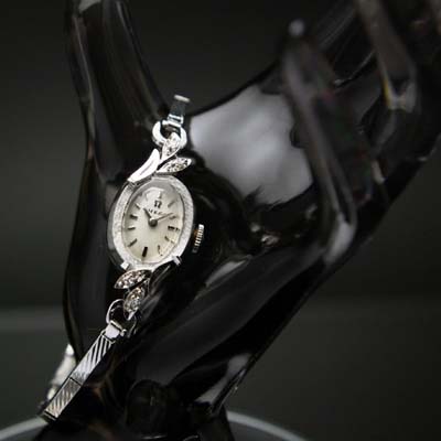 シンプルなバーインデックス(文字盤上で時を示すマーク)に、ボタニカルモチーフをあしらったラグ(時計ベルトの取りつけ部分)は、時計全体を女性らしく優しい印象に仕上げています。ベゼルにあたる部分には細かなエッチングが施され、ラグに2個ずつ配置されたダイヤ装飾とともに上品な輝きを放っています。ブレスは伸縮性のあるタイプですので着脱が簡単で、アンティークウオッチ初心者の方にも取り扱いやすいお勧めの1本です。