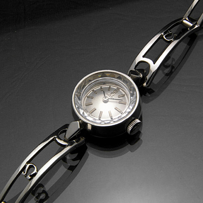 シルバーの文字盤にバーインデックスと黒い針を組み合わせた極めてシンプルなデザイン。しかしブレスレットはこの腕時計の印象を決定してしまうほどユニークなデザインです。通常鎖や紐で構成される部分が大きくくりぬかれ、2本の線で構成されたブレスレットです。12時側、6時側いずれにもオメガマークがはめ込まれ、ブレスレットの強度を増すと共にデザイン性を高めています。