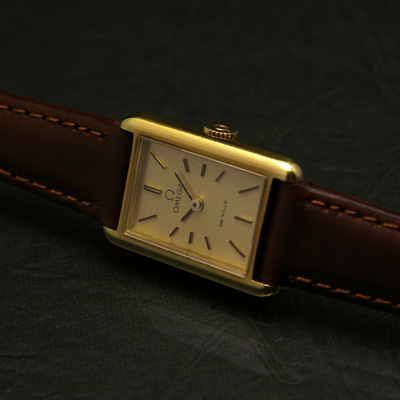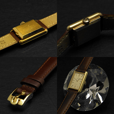 オメガの中でも都会的で洗練されたラインナップとして分類される「デ・ビル」シリーズ。文字盤は長方形でソリッドなデザインですが、ケースサイドに丸みを帯びさせることで女性的で優美な形にまとめています。ケースは価値ある18K無垢。黄味を抑え、日本人の肌にも良く馴染む自然な金色です。最もシンプルなバーインデックス(時を表すしるし)ですので大人の雰囲気も漂います。