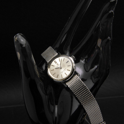 オメガの中でも洗練されたデザインが施されたラインナップとして分類される「デ・ビル」シリーズの一本です。定番ラインである「シーマスター」とのダブルネーム。横20mmとほどよいサイズのケースが特徴です。女性用腕時計はデザインや装着感を優先して文字盤が小さく作られることが多く、時刻の判読が困難なものも少なくないですが、この時計にはそのような心配がありません。大きくすることで機械の安定感も向上し、それでいて手首にほとんど負担のかからない重さに仕上げています。ブレスレットは軽く柔らかな金属製のメッシュベルト。薄型の本体と相まって良好な装着感を実現しています。女性用には珍しい裏蓋一体型ケース。裏蓋にはシーホースの刻印が刻まれています。シルバーで統一された時計ですので、お仕事にも問題なくご使用いただけます。もちろんオフタイムにも。
