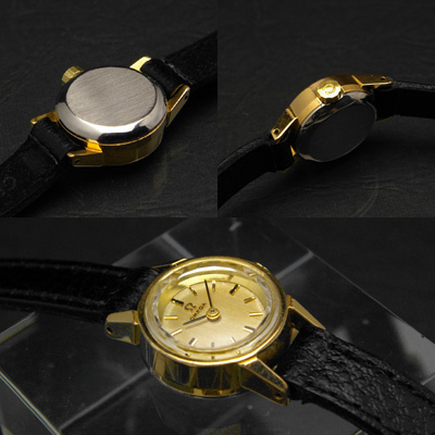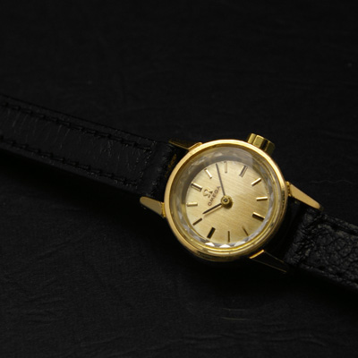 現行のレディース・オメガはかなりマニッシュなデザインになり、色やサイズで女性らしさを表現しているように思われます。一方、この頃のオメガはシンプルデザインを基本にしながら、フェミニンで清潔感のあるデザインに仕上げています。熟成したシャンパンを彷彿とさせる、しっかりとしたゴールドカラーの文字盤。キラキラと輝きを放つプリズム風防は機械式時計のソリッドな印象を打ち消し、アクセサリーのように華やかな印象を与えます。ケース背面は丈夫なステンレス・スチール製ですので長くお使いいただけるでしょう。竜頭、文字盤にはブランドロゴであるオメガマークが輝きます。黒いベルトに合わせていますが、白や茶色など様々な色の革ベルトに交換しても楽しめるはずです。