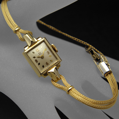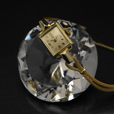 オメガはその知名度もさることながら、丁寧で誠実な時計作りが評価されています。特に機械式時計全盛期だった当時に作られた女性用は、デザインの作り込み方が他のブランドとは一線を画しています。今回ご爽快するこの時計も例にもれず、しっかりとデザインされた一本です。金属の質感が美しいシルバーの文字盤はほぼ正方形。ダイヤ形のインデックス(時を表す印)が放射状に配され、12時、3時、6時、9時のみアラビア数字で表現されています。針はリーフ針ですので女性らしく繊細な印象です。ケースは角型の特徴を生かし、多くの面によって構成されています。価値ある14K製のケース。