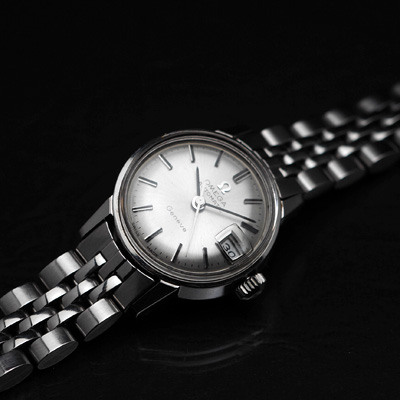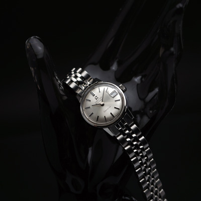 オメガの自動巻腕時計です。女性用では珍しい自動巻(腕の動きでゼンマイの巻き上がる腕時計機構)の腕時計です。シルバーを基調としたシンプルなデザインですのでどんなシチュエーションにも対応できる、守備範囲の広い一本。そろそろよい時計が欲しいなあ、とお考えの貴女におすすめです。