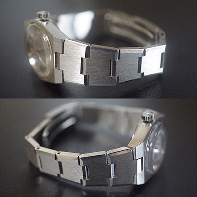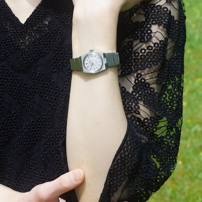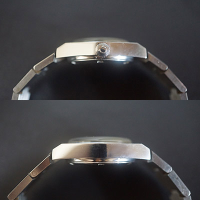 もちろんこの時計も例に漏れず、デザインに手抜きが全く感じられません。ケースやブレスレットのステンレス部分には鏡面仕上げとヘアライン仕上げの2つの仕上げを施すことでメリハリを付け、高級感のある質感に仕上がっています。文字盤上のインデックス(時を表すしるし)を立体的なものにすることで、プリントしたインデックスに比べ視認性の高いものになっています。70年代の香りが漂うかっちりとしたデザイン。女性用の腕時計ながら現在販売されているレディースウオッチほどフェミニンすぎることもなく、仕事にもふさわしいデザインといえるでしょう。