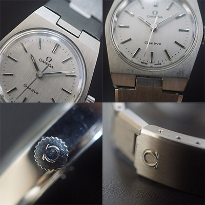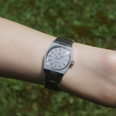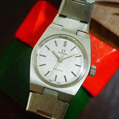 オメガの手巻き腕時計です。シルバーを基調としたシンプルな配色と70年代らしいデザイン。お仕事からカジュアルまで、どんなシチュエーションにも対応できる守備範囲の広い一本。そろそろよい時計が欲しいなあ、とお考えの貴女におすすめです。
