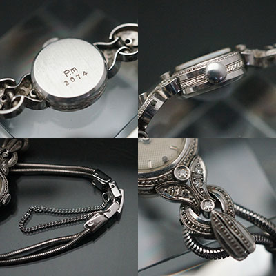 まずはその繊細で魅惑的なデザインについてです。円形の文字盤を覆うケースには、文字盤周辺だけではなく、サイド部分にまで丁寧な彫金が施されています。ここをみるだけでもこの腕時計が普及品として制作されたものでは無いことがわかります。次はラグ(ベルトとケースをつなぐパーツ)に注目してみます。通常、ラグとベルトは直接つながることが多いのですが、アクセサリー要素を期待される腕時計ではその間に別のパーツを差し込み、多段階の構成にすることがあります。この時計は外見上3段の構成(実際は2段)となっています。これにより、腕に着けたときに本体部分が占める割合が多くなり、より華やかな印象を与えることに成功しています。ケースはプラチナ製。ゴールドやシルバーとは異なる、落ち着いて上品な輝きを放ちます。加えて、合計12粒の石装飾が時計の宝飾品としての魅力と価値をあげています。