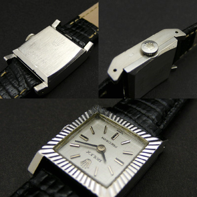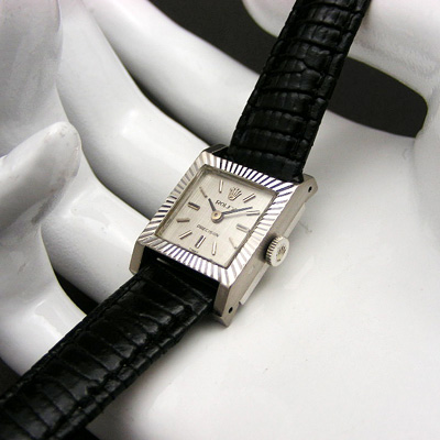ロレックスのアンティーク・レディースウオッチです。スクエアのケース前面には放射状の刻みが入れられ、高級感を演出。文字盤上に施された縦横に走るサテーナ処理が時計の印象を優しいものにしています。18Kケースですので質感も高く、一方でスポーティーなファッションでもよく似合います。おとなしいデザインなのでオンタイムにも活躍。竜頭や裏蓋、文字盤にはロレックスを象徴する王冠マークが輝きます。人気のカメレオンや、高級品であるチェリーニにも搭載されたCal.1400というムーブメントを搭載した機械式時計です。手巻きのムーブメントですので電池交換の必要がありません。毎朝巻上げることで時計に命を与えるのもアンティーク時計の楽しみの一つです。シンプルだからこそ、ベルトを変えれば全く異なった印象になる、可能性を秘めた時計です。あなたのファッションをワンランクアップさせる、一生の宝物になりうる一本です。