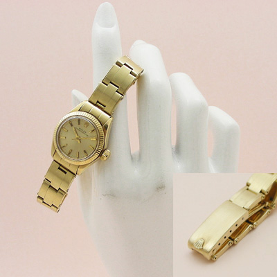 レディース・ヴィンテージ時計の人気モデル「ロレックス・オイスターパーペチュアル」の14Kモデルです。シリアル番号から1977年頃に製造された時計だと思われます。その知名度やブランド力ばかりに注目が集まるロレックスですが、人気の理由のひとつとして確かな製造技術による作りの良さを上げることが出来ます。この時計も製造から数十年が経過したヴィンテージモデルですが、現在もしっかりと時を刻み続けています。高級感溢れる14金無垢のケースはステンレスなど他の素材では味わえない満足感があります。18Kのようなギラギラした印象もありません。またアンティークの雰囲気溢れるリベットブレス(サイドに鋲の打たれたブレス)も魅力の一つです。身につけることでゼンマイの巻き上がる自動巻仕様。一生お使いいただけるおすすめの一本です。