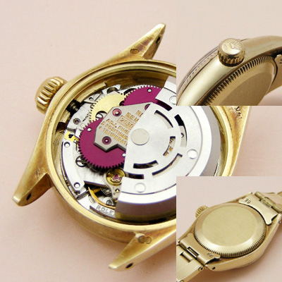 調整済みのムーブメントは巻上げたときの感触も良く、問題なく動作しています。時計の精度は姿勢や利用環境によって異なりますが、1日に60秒内外のずれに収まっています。ケース、ブレスには金素材特有のスレやコキズがみられますが、アンティークの味として納得できるレベルです。ブレスレットは超音波洗浄済みですので気持ちよくお使いいただけます。ベルトの取り付け幅は約13mmです。ケースの大きさは約24mm(竜頭は除きます)です。腕周りが最大で17cm強までご使用いただけます。