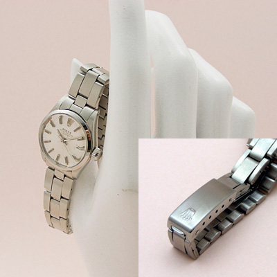レディース・ヴィンテージ時計の人気モデル「ロレックス・オイスターパーペチュアル」のシルバー文字盤です。シリアル番号から1967 年頃に製造された時計だと思われます。その知名度やブランド力ばかりに注目が集まるロレックスですが、人気の理由のひとつとして確かな製造技術による作りの良さを上げることが出来ます。この時計も製造から数十年が経過したヴィンテージモデルですが、現在もしっかりと時を刻み続けています。シルバーで統一された無駄のないスタンダードなデザインですので、使用するシーンを選びません。3連のブレスレットは装着感もよく、スポーティながら知的な印象を与えます。デイト表示機能付ですので実用性も十分です。身につけることでゼンマイの巻き上がる自動巻仕様。オンタイム、オフタイム問わず毎日使えるおすすめの一本です。
