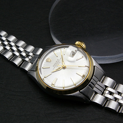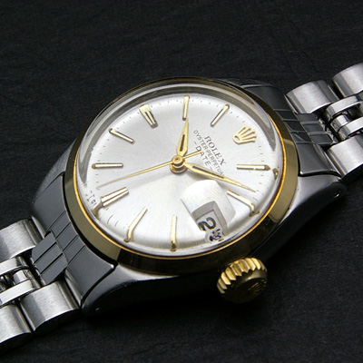 レディース・ヴィンテージ時計の人気モデル「ロレックス・オイスターパーペチュアル」のシルバー文字盤・コンビ仕様です。シリアル番号から1964年頃に製造された時計だと思われます。その知名度やブランド力ばかりに注目が集まるロレックスですが、人気の理由のひとつとして確かな製造技術による作りの良さを上げることが出来ます。