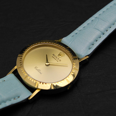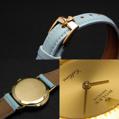 インデックス(文字盤上で時を示すマーク)の代わりとして、文字盤周囲に時刻がわかりやすいバーが刻まれていることで、シンプルな美しさに実用性を備えています。この時計の特徴でもあるケースの楕円形を崩さないように竜頭がケース内側に配置され、やわらかく女性らしい印象を与えます。涼しげなサックスブルーの革ベルトにはロレックスの王冠があしらわれた尾錠(ベルトのバックルにあたる部分)を合わせています。ケースは18KYG、尾錠はめっきです。