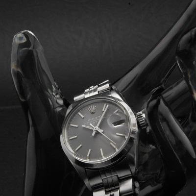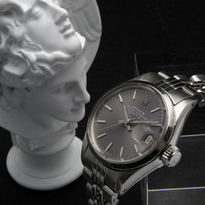 レディース・ヴィンテージ時計の人気モデル「ロレックス・オイスターパーペチュアルデイト」のグレー文字盤です。シリアル番号から 1966年頃に製造された時計だと思われます。その知名度やブランド力ばかりに注目が集まるロレックスですが、人気の理由のひとつに確かな製造技術による作りの良さをあげることが出来ます。この時計も製造から数十年が経過したヴィンテージモデルですが、現在もしっかりと時を刻み続けています。