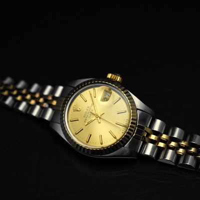 レディース・ヴィンテージ時計の人気モデル「ロレックス・オイスターパーペチュアルデイト」のゴールド文字盤です。シリアル番号から1979~1980年頃に製造された時計だと思われます。その知名度やブランド力ばかりに注目が集まるロレックスですが、確かな製造技術による作りの良さが人気の理由であることは間違いありません。この時計も製造から数十年が経過したヴィンテージモデルですが、現在もしっかりと時を刻み続けています。
