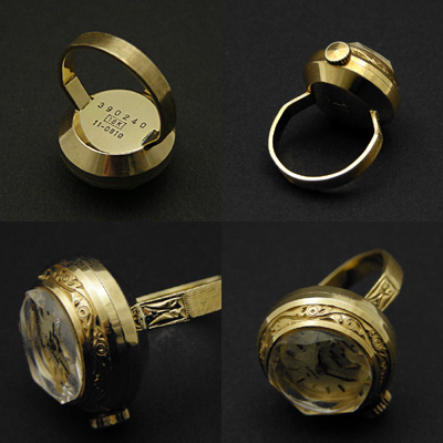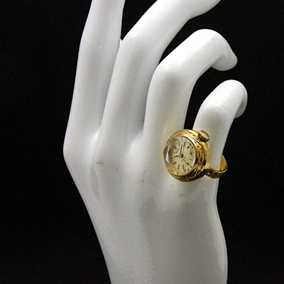 セイコーのアンティークウオッチです。希少な指輪タイプの時計です。機械式時計の技術が円熟すると共に、女性用のムーブメントは小型化が進み、指輪の大きさに納めることが出来るようになりました。ベースは腕時計ですので腕に着けたときよりも厚みは感じられる物の、ボリューミーな感じがかえってかわいらしく、指先でも十分な存在感をはなちます。シャンパンゴールドの文字盤は表面の加工により、程よい落ち着きと高級感が感じられます。文字盤周囲には丁寧な細工が、またリング部分の端にも雰囲気のある細工が施されています。価値のある18金ケース。同じ物を着けている人はまず合わないであろうと思われる、レアなアイテムです。さまざまなファッションのアクセントとしてお使いください。普段腕時計は使わない、という貴女にもおすすめの一本です。
