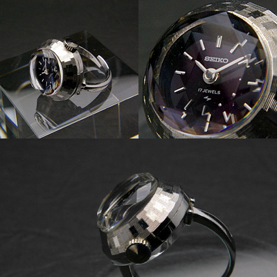 セイコーのアンティークウオッチです。希少な指輪タイプの時計です。機械式時計の技術が円熟すると共に、女性用のムーブメントは小型化が進み、指輪の大きさに納めることが出来るようになりました。ベースは腕時計ですので腕に着けたときよりも厚みは感じられるものの、ボリューミーな感じがかえってかわいらしく、指先でも十分な存在感をはなちます。深い紫の文字盤は日本の伝統色。程よい落ち着きと高級感が感じられます。文字盤周囲には丁寧な細工が、またリング部分の端にも雰囲気のある細工が施されています。カットが施された風防はアクセサリーを意識してのデザインでしょうか。同じ物を着けている人はまず合わないであろうと思われる、レアなアイテムです。さらに未使用のデッドストック品という、今後当店でも入手できるかどうかわからない逸品です。当時のタグも付属します。さまざまなファッションのアクセントとしてお使いください。普段腕時計は使わない、という貴女にもおすすめの一本です。