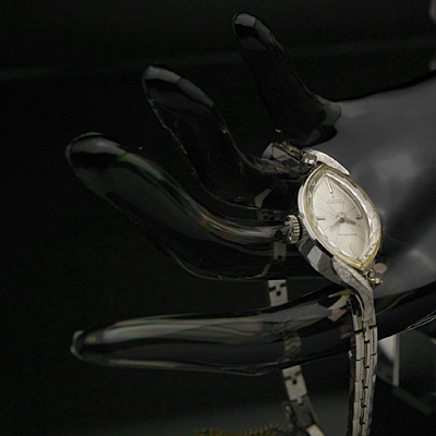 セイコーの女性用アンティーク腕時計です。14Kホワイトゴールドのケースにプリズム風防が華やかさを添えています。12・3・6・9 時位置にはバーインデックスが、それ以外の時刻には文字盤に放射線状のラインがデザインされており、シンプルなデザインと時刻の見やすさを両立しています。繊細なブレスにつながる部分にはボタニカルなデザインが施され、落ち着いた雰囲気と可愛らしさをあわせ持つ腕時計に仕上がっています。