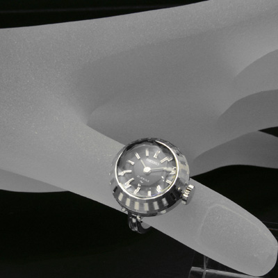 ベースは腕時計ですので腕に着けたときよりも厚みは感じられるものの、ボリューミーな感じがかえってかわいらしく、指先で存在感をはなちます。同じ物を着けている人はまず出会わないであろうと思われる、レアなアイテムです。さまざまなファッションのアクセントとしてお使いください。普段腕時計は使わない、という貴女にもおすすめの時計です。意外性、インパクトの点からプレゼントにも最適の一本でしょう。