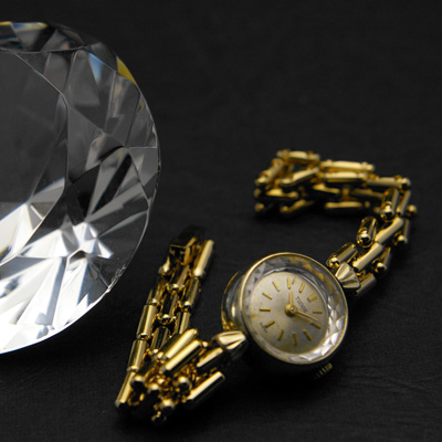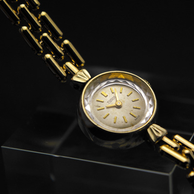人気の高いチュードル社のアンティークウオッチです。チュードルは英国でロレックスのオイスターケース(防水ケース)を販促するために作られたディフュージョン・ブランドです。初期にはイギリスで人気の高いチューダー家の紋章である「薔薇」をモチーフに採用し、そのデザインはもとよりロレックス譲りの性能の高さから人気を集めました。近年の機械式時計ブームでも再評価されているブランドのひとつです。今回ご紹介する腕時計は雑貨店などでも注目を集める金色で華奢な腕時計です。アンティーク感溢れるプリズム風防が魅力。ケースのキズや飴色にやけた文字盤はアンティークの証です。