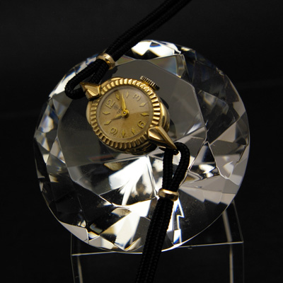 盾の中に薔薇を描いた「タテバラ」と呼ばれるロゴが12時位置に描かれています。「タテバラ」はデカバラやコバラなどと比較して残存数が少なく、アンティークウオッチの中でも希少とされている時計の一つです。3時、6時、9時、12時のみアラビア数字、そのほかは菱形のインデックス(時を表すしるし)を採用し、女性用腕時計の狭い文字盤のなかで時間の見やすさとデザイン性を両立しています。ケース自体はレディース時計として一般的な形ですが、フェイスを円形にすることでより女性的なデザインとなっています。ベゼル(風防周囲)は等間隔で刻みの入ったいわゆるピラミッドベゼルです。