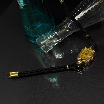 角形のケースに樽形のミニッツマーカー(分を表すしるし)を描いたリズム感のあるデザイン。時間が読み取りやすく人気の高いアラビックインデックス(時を表すしるしがアラビア数字のもの)です。ケース素材は9Kです。黒と金で統一された配色はこれぞアンティーク時計といった面持ちです。