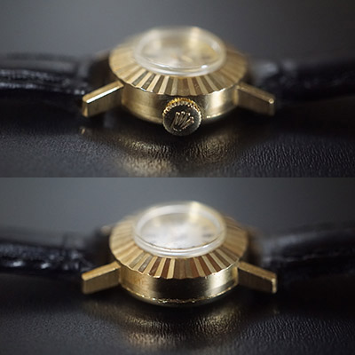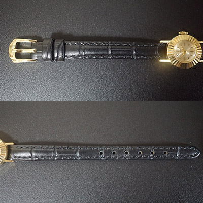 ケース、風防などにはやわらかい金素材故のスレやコキズがありますが、致命的な抉れや凹みなどはありません。動作確認調整済みのムーブメントは快調に動作しています。時計の精度は姿勢や利用環境によって異なりますが、1日に60秒内外のずれに収まっています。ケースは横(竜頭を除く)約16mmです。ラグ幅は8mm。ベルトや尾錠は社外品ですが、質感の良い未使用品を合わせています。