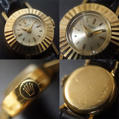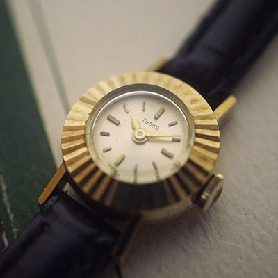 チュードルの18Kケースモデルです。小ぶりなラウンドケースはロレックスやチュードルで人気の「カメレオン」を彷彿とさせます。カメレオンの特徴であるベルトの交換は、実は結構手間であることが知られています。そのカメレオンの形状の魅力だけ拝借して、実用性の高い革ベルト仕様にしたのがこのモデルとお考えください。当店おすすめの女性用アンティークウオッチです。