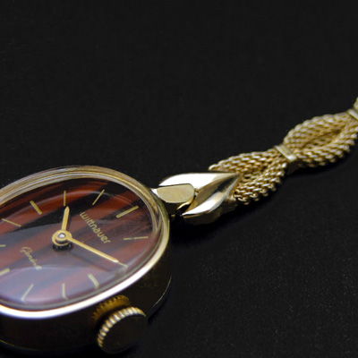 木目調の文字盤はアンティーク時計としても珍しく、現在でも大変稀少です。レディース腕時計には文字盤の色が明るいものが多く、この時計のようにシックな色合いは少ないため、さり気なく個性が光ります。針やインデックス、ブランドロゴの金色によって時刻は見やすく高級感も十分。ベルトはユニークなデザインの金属製のメッシュベルトです。メッシュベルトは着け心地もよく、またエクステンション機能付きなので付け外しが簡単で、初めてのアンティーク時計としてもオススメです。