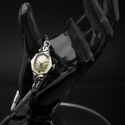 経年変化によりアンティーク感の増したシルバーのダイアルにバーインデックス(文字盤上で時を示すマーク)というシンプルな文字盤デザインながら、特徴的な8角形のケースがこの時計を一気に個性的なものにしています。中心から放射状に伸びたベゼルの装飾は宝飾品としての完成度を高めています。ラグ(ベルトを留める部分)の有機的なデザインもアンティークならでは。ケースは価値ある14KWGです。華美さをおさえたホワイトゴールドですのでカジュアルシーンだけではなくお仕事にも、また冠婚葬祭にもお使いいただけます。
