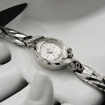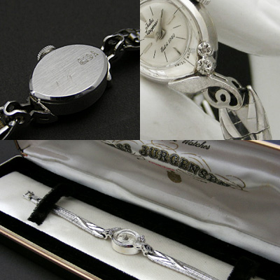 ユール・ヤーゲンセンの手巻き腕時計です。ユール・ヤーゲンセン社は日本ではあまり目にすることがありませんが、スイスの古い時計メーカーです。アンティーク時計の定番であるアーモンド型のケースですが、時計表示部分を円形にすることでユニークなデザインに仕上げています。アール・デコ調のラグのデザインはアンティークの雰囲気に満ちています。小さいながらも十分な輝きを放つダイヤが各ラグに2つずつ配されています。ケースは価値のある 14Kホワイトゴールド。ホワイトゴールドの時計は金色の時計に比べ、日本人の肌に違和感なく馴染みます。ドレスなどの特別な装いはもちろんのこと、T シャツとジーンズのようなラフでカジュアルな格好にさらりと着けても素敵です。当時の箱が付属しますので、大切な人へのプレゼントとして、また自分へのご褒美としてもオススメです。