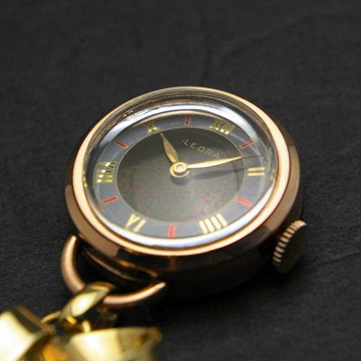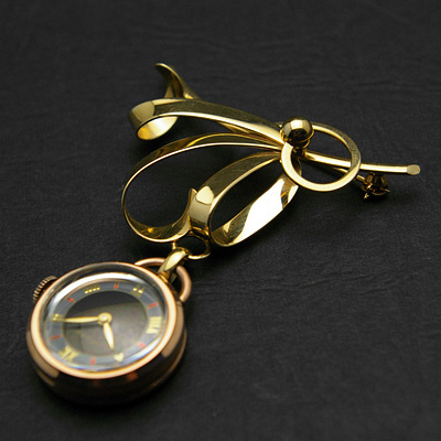 珍しいブローチ仕様の時計です。女性用のアンティーク時計は数多くありますが、ブローチ・ウオッチは当時の生産数が少なく、また現在国内で流通している数も少ないために入手が困難な一品です。グレーと黒のツートーンの文字盤上に、偶数時のみローマ数字でインデックスを配したアンティークらしいデザイン。優雅さを感じられる曲線で構成された針も魅力的です。ケースは10Kのピンクゴールドです。ピンクゴールドのケースはその女性的な色合いと醸し出される上品さから、現在数多くのブランドアクセサリーで積極的に用いられています。リボン状のブローチ部分には10KTの表示があります。装着したときに見やすいよう文字盤は天地逆に付いています。シンプルなファッションのアクセントとして使うと、ネックレスやイヤリング以上の存在感があります。