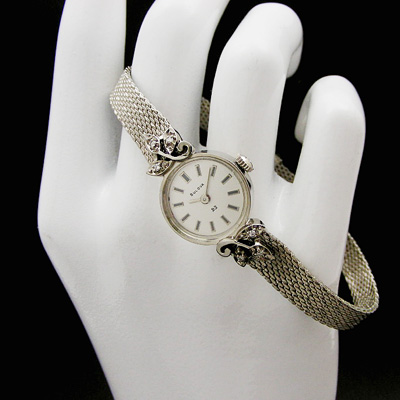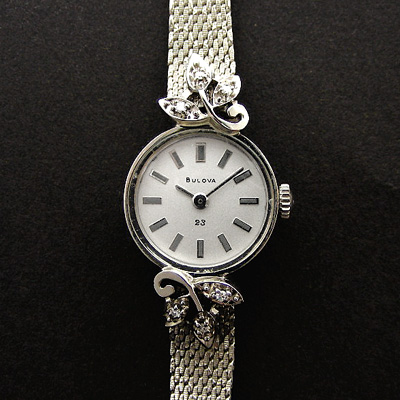 ブローバの手巻き腕時計です。デザインされたラグに合計6粒のダイヤを配した高級カクテルウオッチです。ケース素材は価値のある14K のホワイトゴールド。ホワイトゴールドの時計は金色の時計に比べ、日本人の肌に違和感なく馴染みます。ラグ部分は植物をモチーフにした女性らしいデザインに仕上げてあります。現代の機械化された製法では再現できない、繊細で魅力的な装飾に驚きます。装着感の良いメッシュブレスは10KGFなので、歪みなど起こりにくく安心してお使いいただけます。ドレスなどの特別な装いはもちろんのこと、Tシャツとジーンズのようなラフでカジュアルな格好にさらりと着けてもよく似合います。