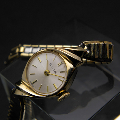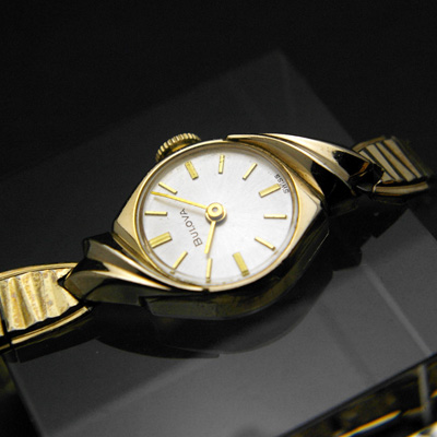 名門ブローバ社のアンティークウオッチです。ブローバ社は先進的な技術を取り入れた時計を数多く輩出し、音叉時計「アキュトロン」で一時代を築いたことで知られています。点対称なデザインが美しい、アール・ヌーヴォーデザインのケース。12時位置、6時位置のラグには上質な切子を思わせる有機的なデザインが施されています。規則的な刻みの施されたブレスレットは多数のパーツから構成されており、装着感を向上させています。文字盤はブランド名とバーインデッックスのみというシンプルさ。女性らしい、華奢でかわいらしいアンティーク腕時計です。