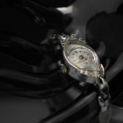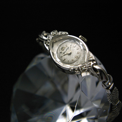 アーモンド型のケースにラウンドの文字盤が収められており、プリズム風防もゆったりとした輝きを放っています。シンプルなバーインデックスによって時計の印象が華美になり過ぎず、上品な仕上がりに。ベルトを取り付けるラグ部分は同年代、同価格帯のアンティーク腕時計の中でも突出して手の込んだデザインです。等間隔でキュッとしぼったメッシュベルトが個性的なアンティークウオッチです。
