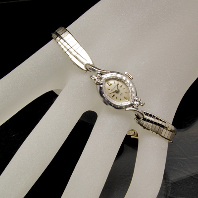 ブローバの手巻き腕時計です。ブローバ社は先進的な技術を取り入れた時計を数多く輩出し、音叉時計「アキュトロン」で一時代を築いたことで知られています。今回ご紹介するのは華奢なケースに6ポイントのダイヤ装飾が施された女性的なデザインの腕時計です。