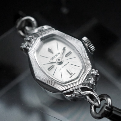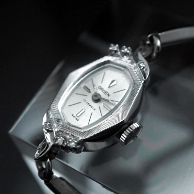 グリュエンのアンティークウオッチです。フェイスは少し縦長で頂点のある変形オーバル(楕円)型。(さらに詳しく)