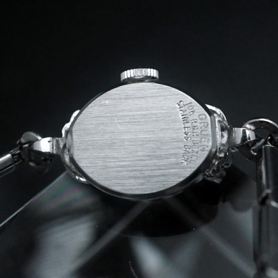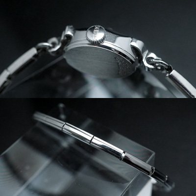 フェイスは少し縦長で頂点のある変形オーバル(楕円)型。実際の大きさよりも華奢な腕時計に見えます。8角形のベゼル部分には丁寧な彫りが施され、光の当たり方によって様々な表情をみせてくれます。ケースは10KRGP、ステンレススチールバックですので腐食にも強く、長くご使用ただけます。ラグ(ベルトの取り付け部分)は有機的なデザインのなかに小粒の石を配し、キラキラ感が増して魅力的です。ブレスレットは伸縮性のある1連のタイプで、そのシンプルさが時計本体の豪華さを際だたせるのに一役買っています。